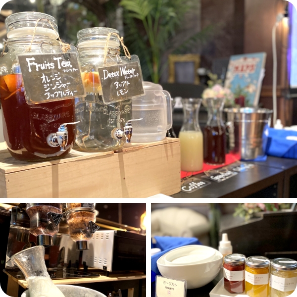 充実のドリンク ドリンク&スープ味噌玉を使った数種類のお味噌汁や日替わりスープ、体に良いデトックスウォーター、フルーツティーなどドリンクも充実しています。